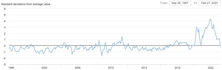 1997년부터 공급망 압력 데이터를 추적하여 평균값을 0으로 보고 평균에서 떨어진 표준편차로 측정